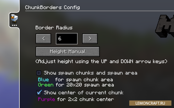 Мод ChunkBorders добавляет в игру возможность визуально увидеть границы чанков. Данный мод будет полезен в случаях, когда при постройки городов обязательно нужно знать, где именно заканчивается граница чанка. Кроме этого мод позволяет определить границы чанков, где спавнятся мобы.